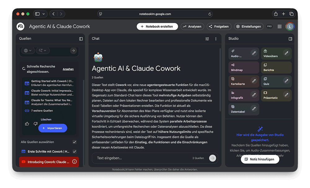 Der zentrale Unterschied zu klassischen Chatbots: NotebookLM nutzt diese Materialien als feste Wissensbasis. Inhalte werden kaum ergänzt oder interpretiert, sondern direkt aus den Quellen abgeleitet. Dadurch eignet sich das Tool besonders für strukturierte Wissensarbeit, interne Dokumentation und Content-Aufbereitung.